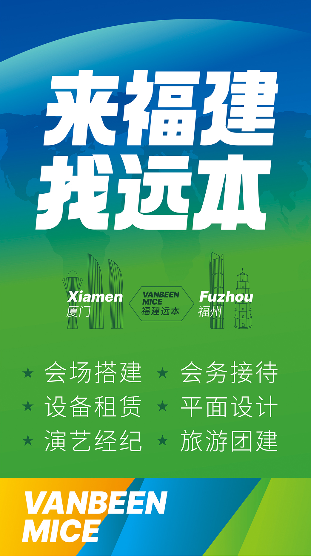 廈門遠本成立于2013年,是一家集策劃設計、落地搭建以及會議接待等全案服務的DMC公司。公司擁有LED屏幕、燈光音響、木作工廠等專業舞美設備,擁有一批專業穩(wěn)定的策劃設計和會務接待團隊,能夠快速、精準地為客戶提供優(yōu)質的策劃、設計、搭建、接待等服務。公司已服務過華為、阿里、麥當勞、中國移動、埃克森美孚、興業銀行、招商銀行、華潤三九、齊魯制藥、萬邦制藥等國內外知名企業,并成功入選中國國旅、中旅、康輝國旅、錦江國旅、中智商展、墨馬傳媒等國內知名PCO公司供應商庫。